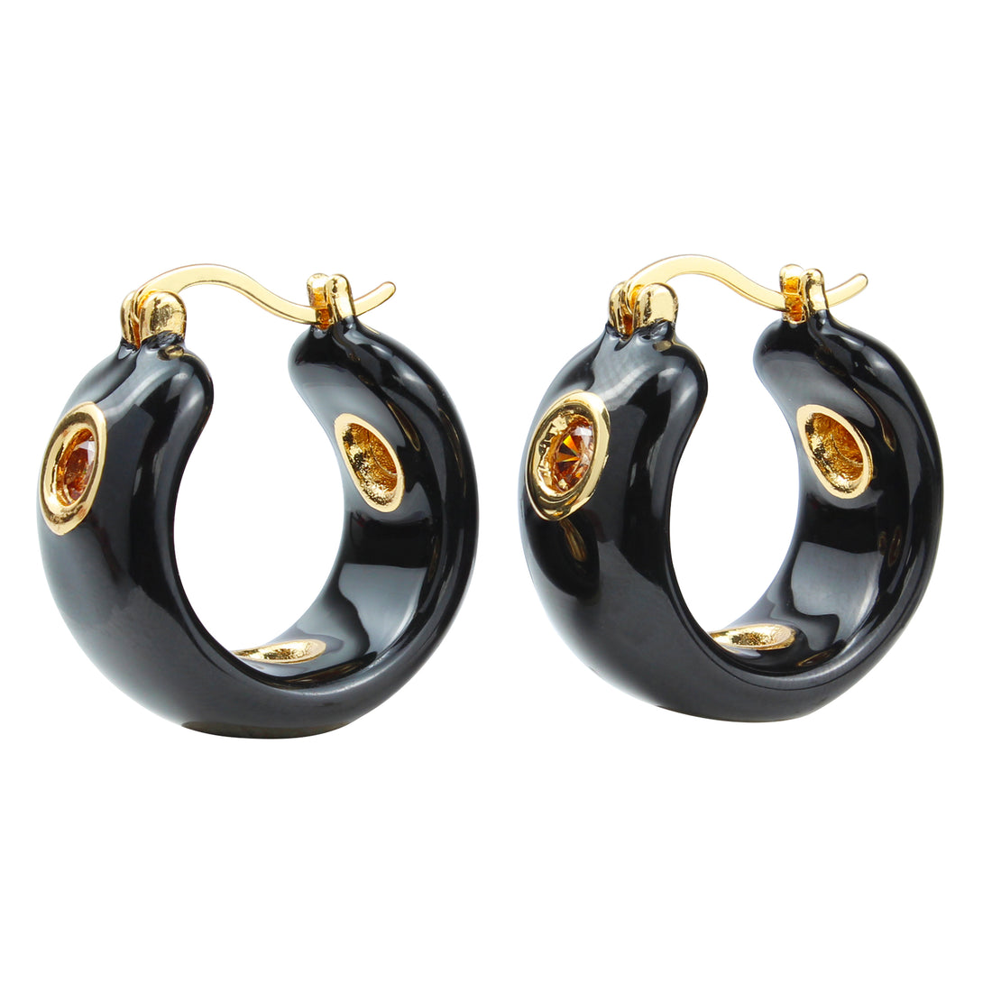 Elegant Black Zirconia Hoop Earrings β 18K Gold Plated with Glossy Enamel Finish & PVC Shine π€