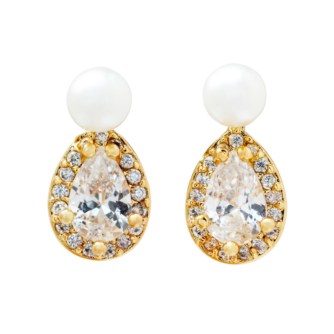 Dewdrop Pearl Stud Earrings β 14K Gold Plated Drop Earrings with Zirconia & 925 Silver Posts, Elegant Jewelry for Women