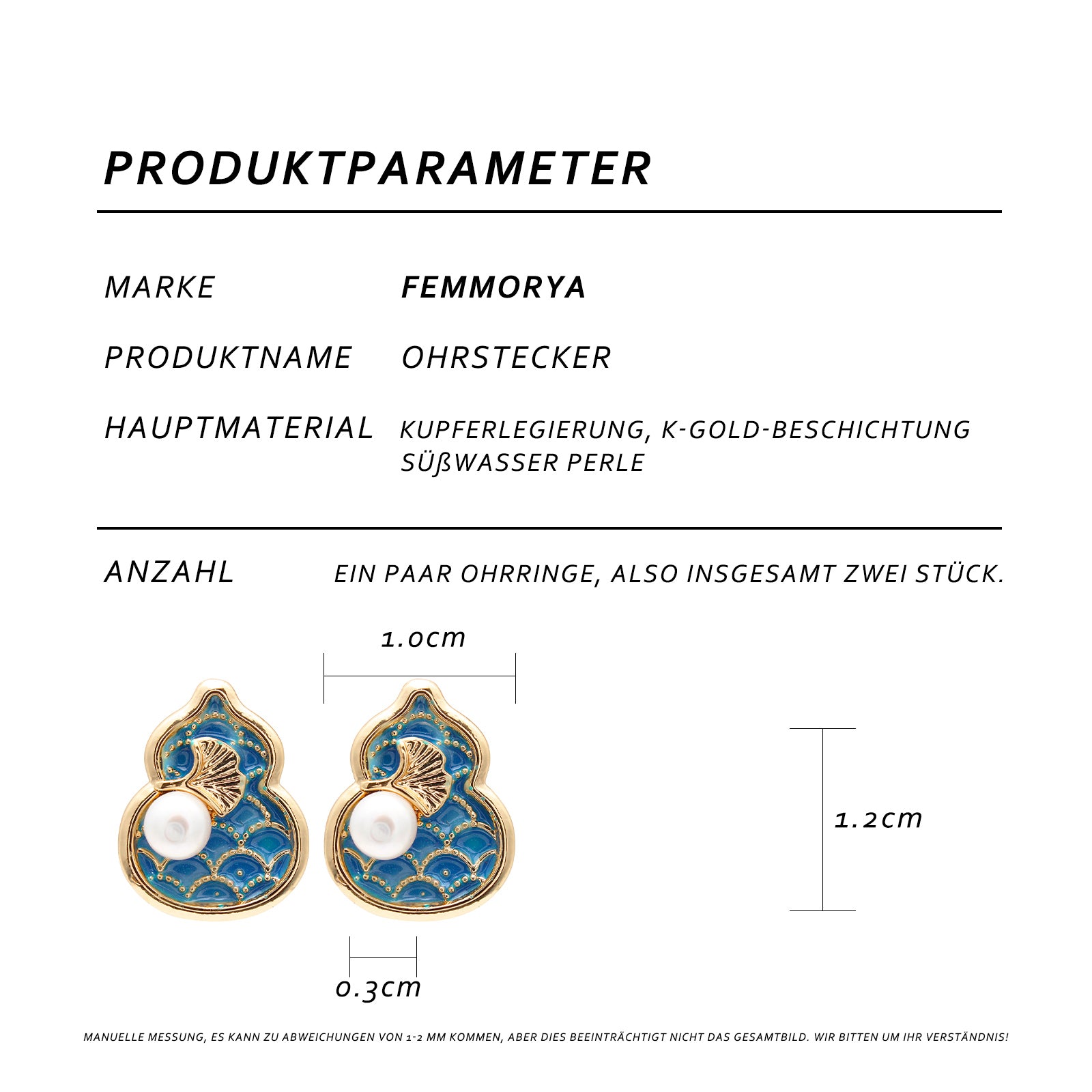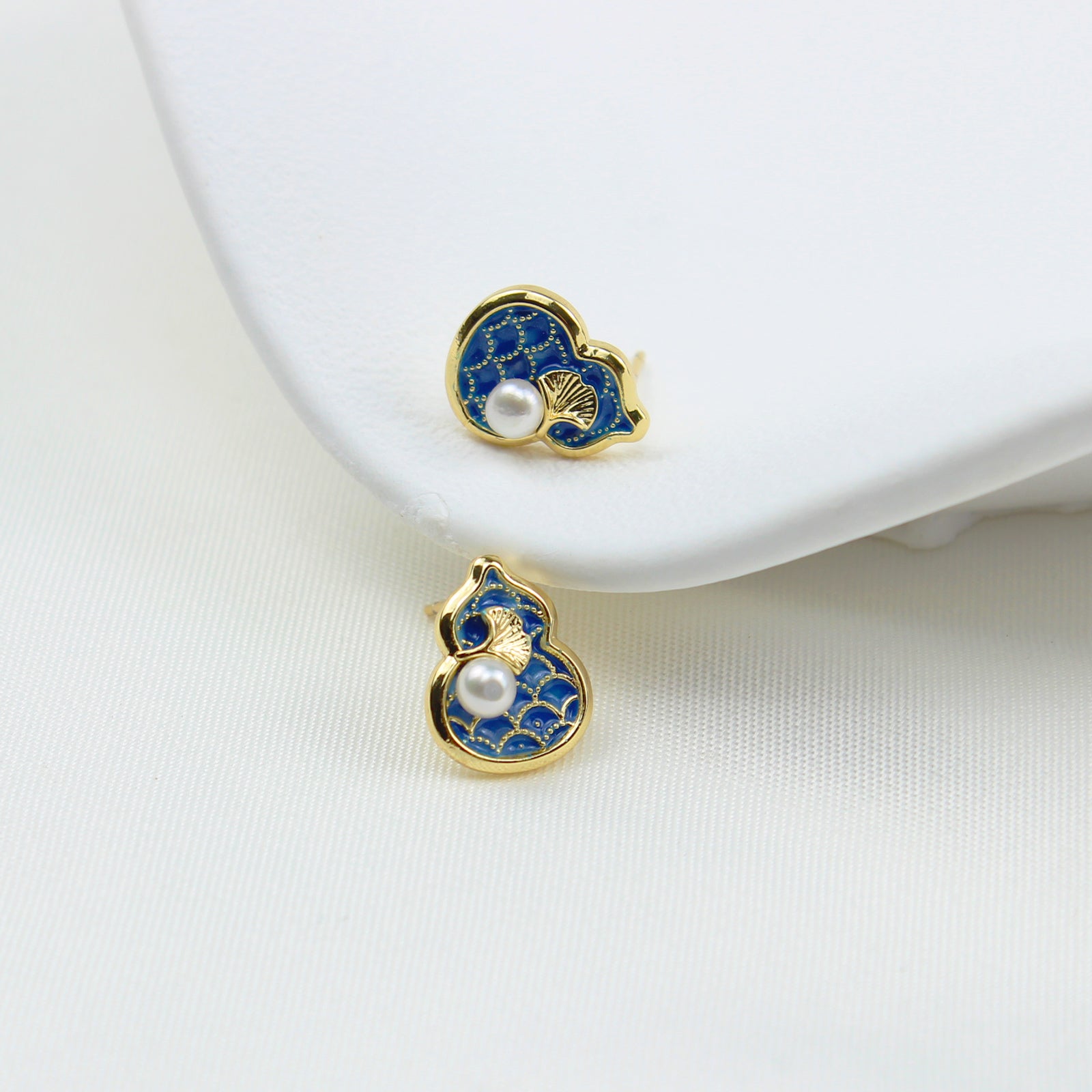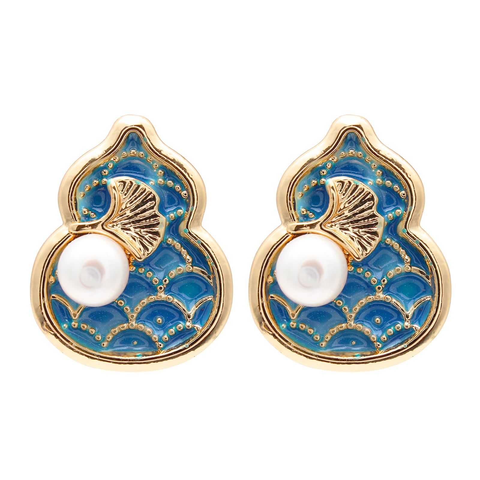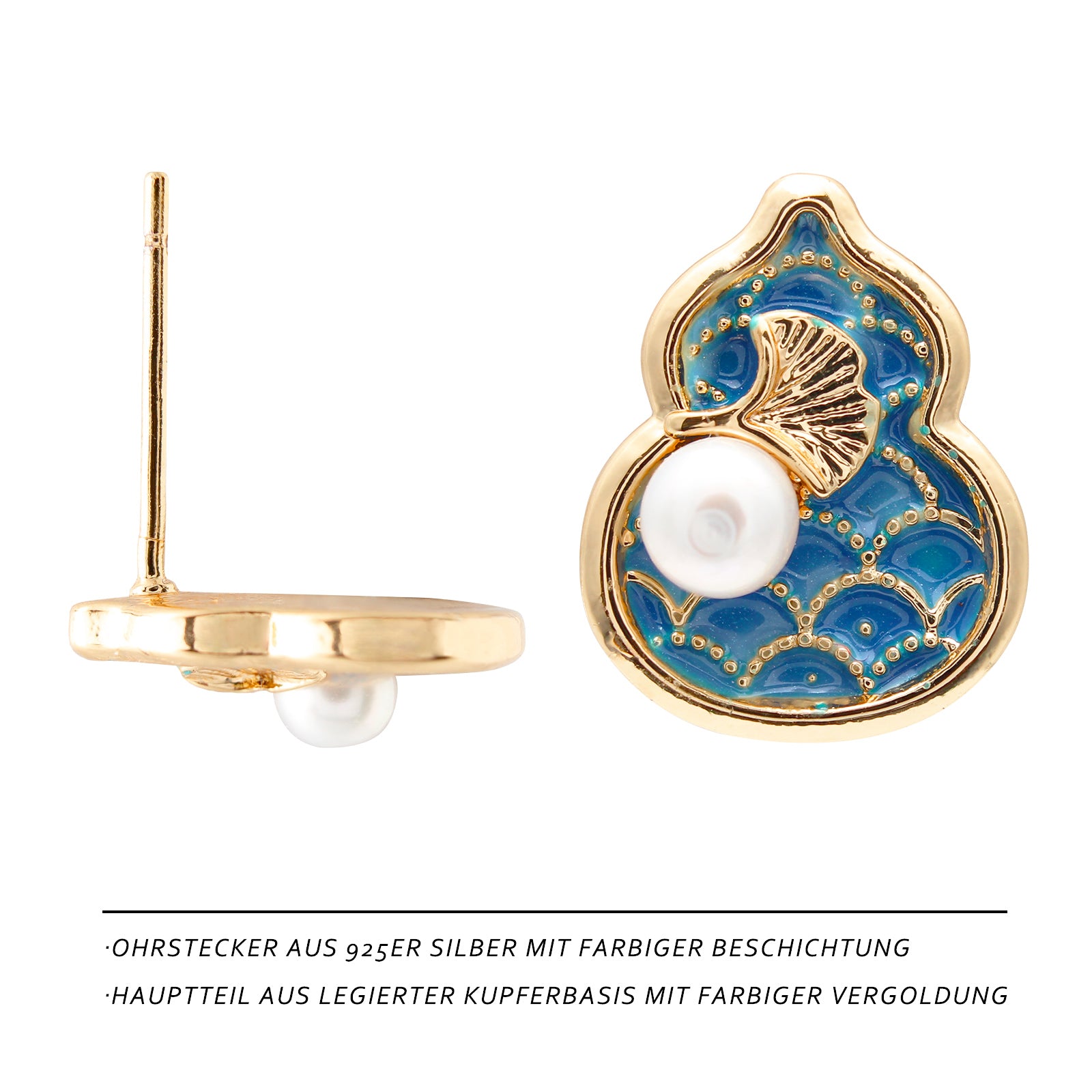 Chinesische Ohrstecker Damen – Ginkgo & Kalebasse Design mit Süßwasserperle, 925 Silber & 14K Vergoldet, Blaue Emaille, Elegante Geschenkbox