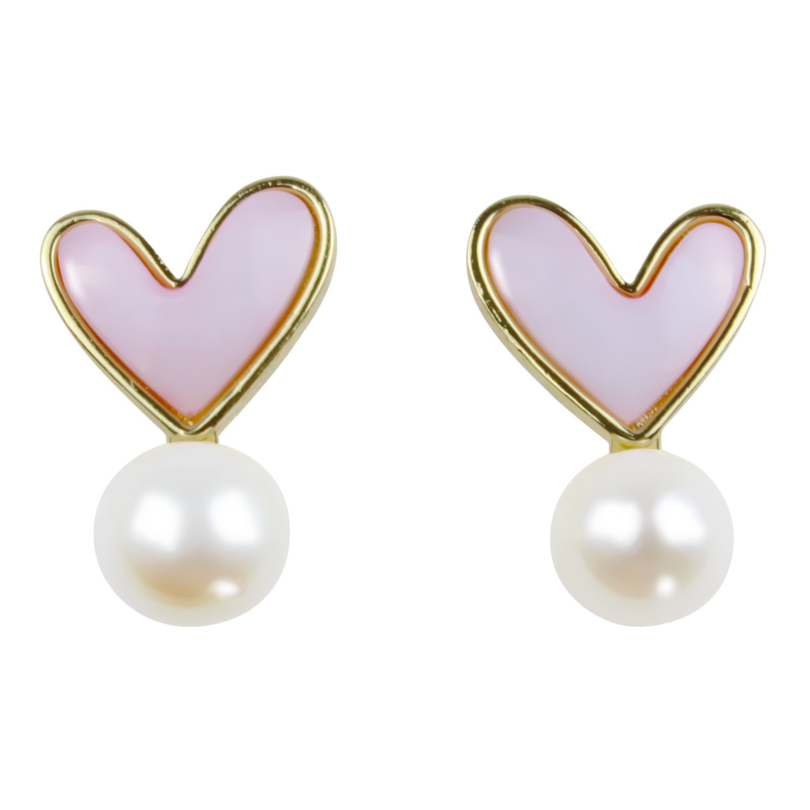 Erste Liebe Perlenohrringe – Rosa Herz mit Süßwasserperle, handgemalt, 14K vergoldete Kupferlegierung, süßes & romantisches Design für Alltag und besondere Momente