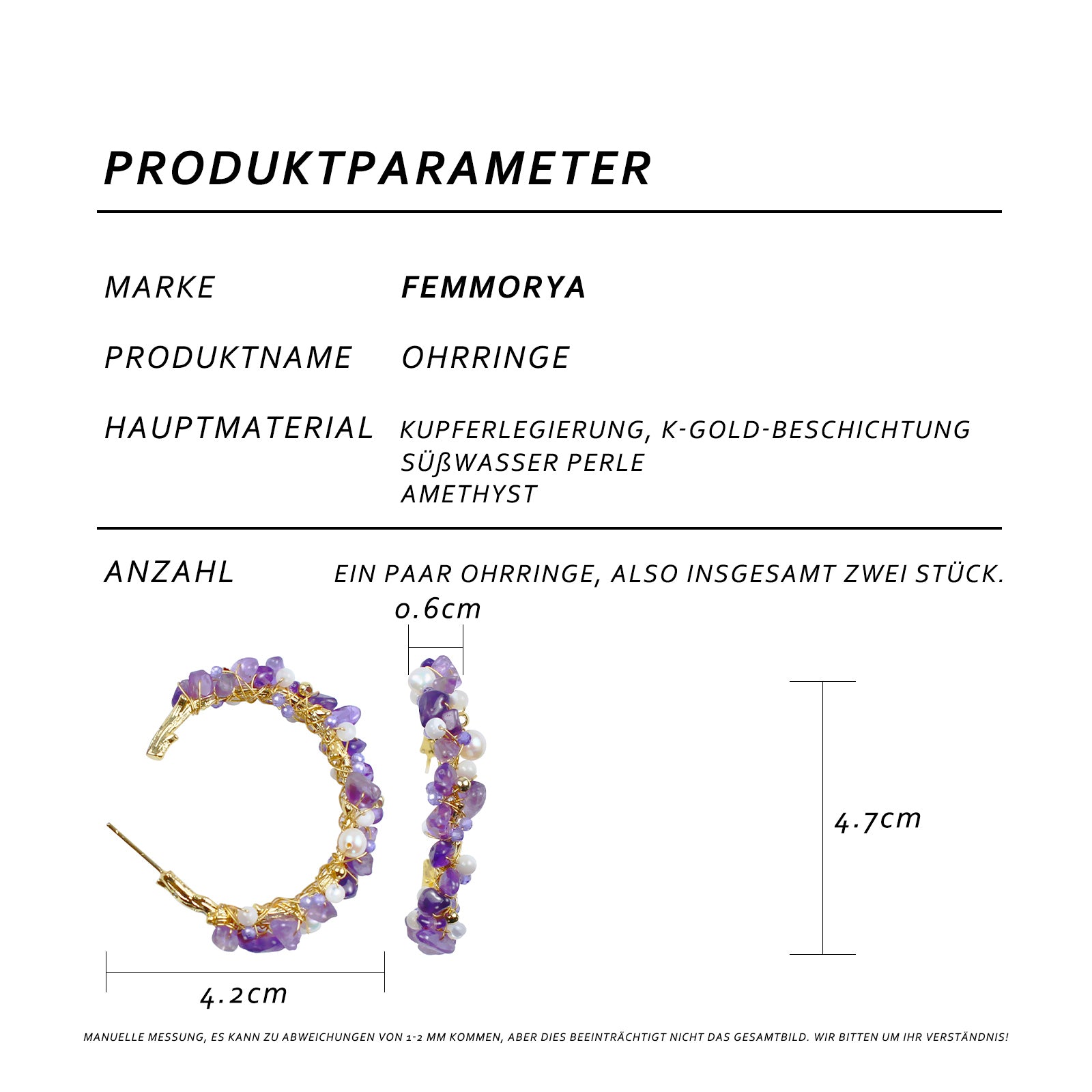 Wie ein funkelnder Nachthimmel schmiegen sich Amethyst und Süßwasserperlen an diese großen, goldglänzenden Creolen – kraftvoll, feminin und voller Aura. Die violetten Amethyst-Steine symbolisieren Stärke und Selbstbewusstsein, während die zarten Perlen einen Hauch von Eleganz und Ruhe hinzufügen. Gefertigt aus 14K vergoldeter Kupferlegierung mit 925er Silberstift, sind sie angenehm zu tragen und ideal auch für empfindliche Ohren.