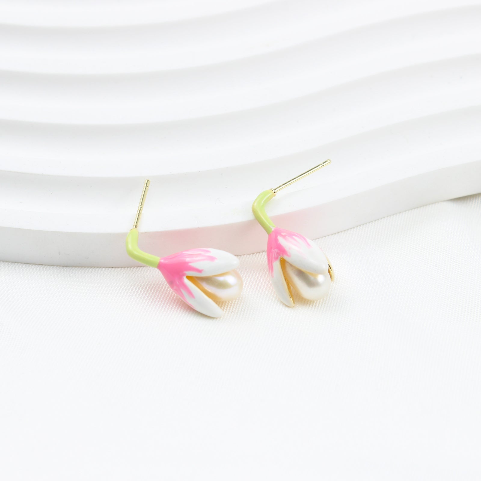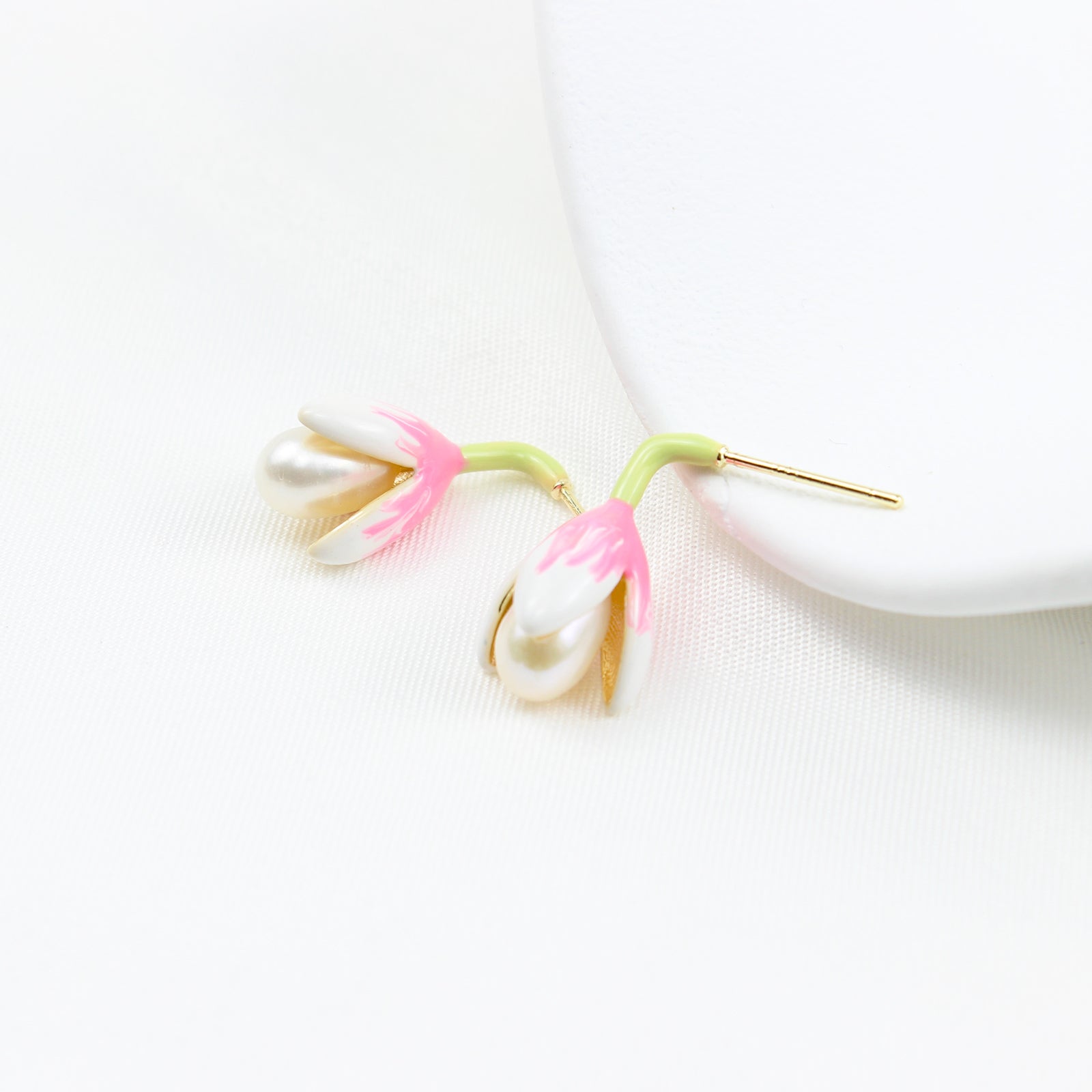 Magnolien Perlen Ohrstecker – Rosa Emaille mit Süßwasserperle, 14K Vergoldet & 925 Silber, femininer Schmuck mit Geschenkbox für Damen