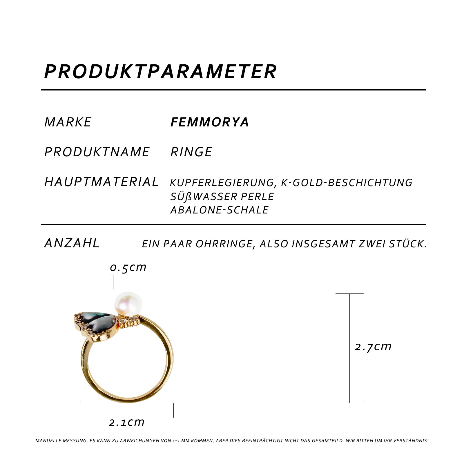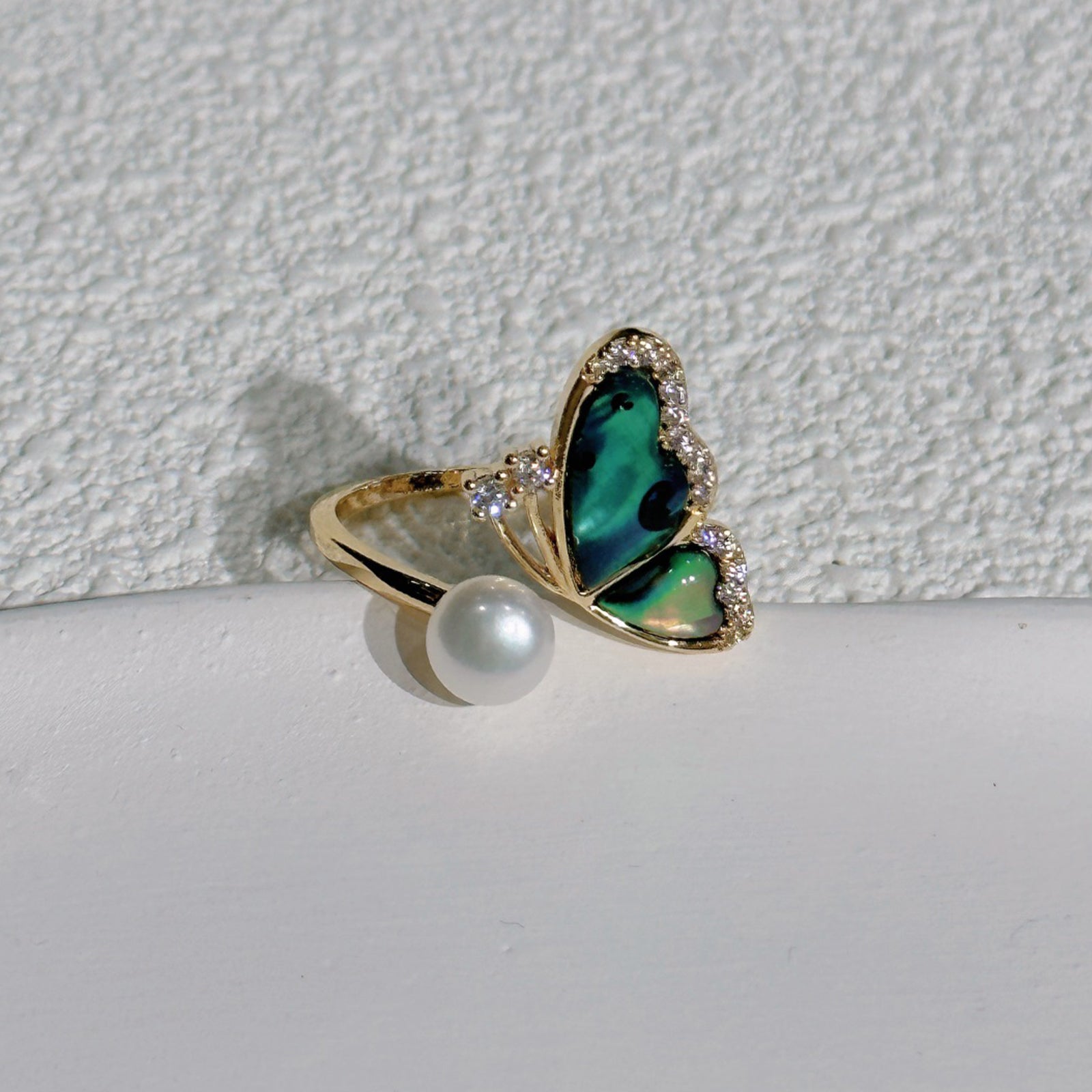 Schmetterling Perlenring – Offener Verstellbarer Ring mit Grüner Abalone & Süßwasserperle, 14K Vergoldet, Eleganter Damenring