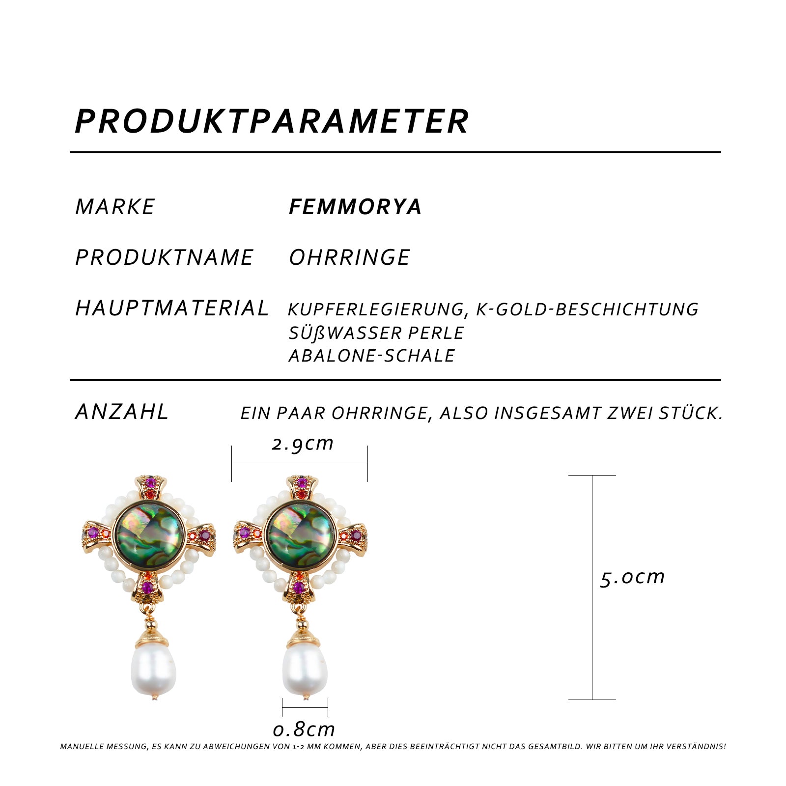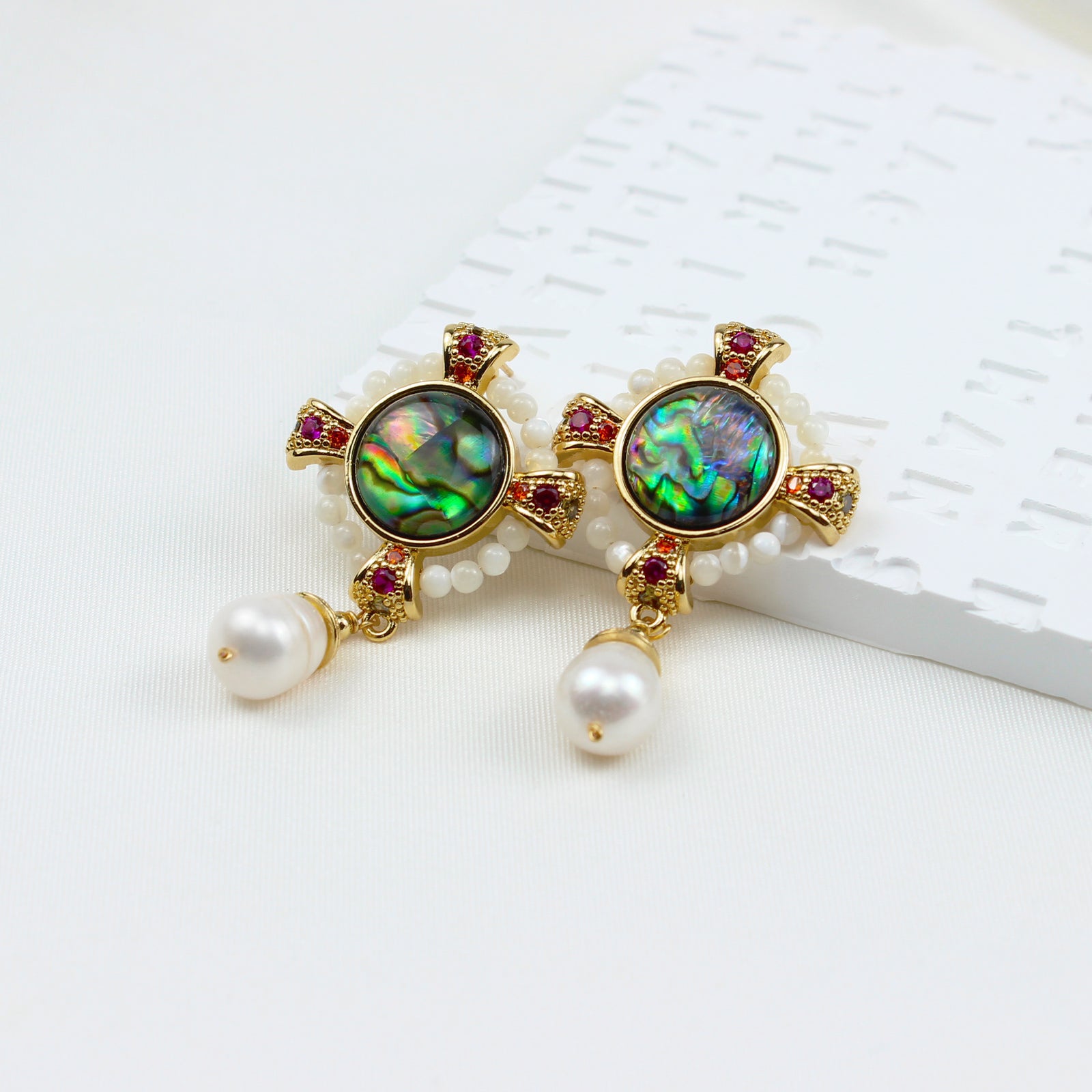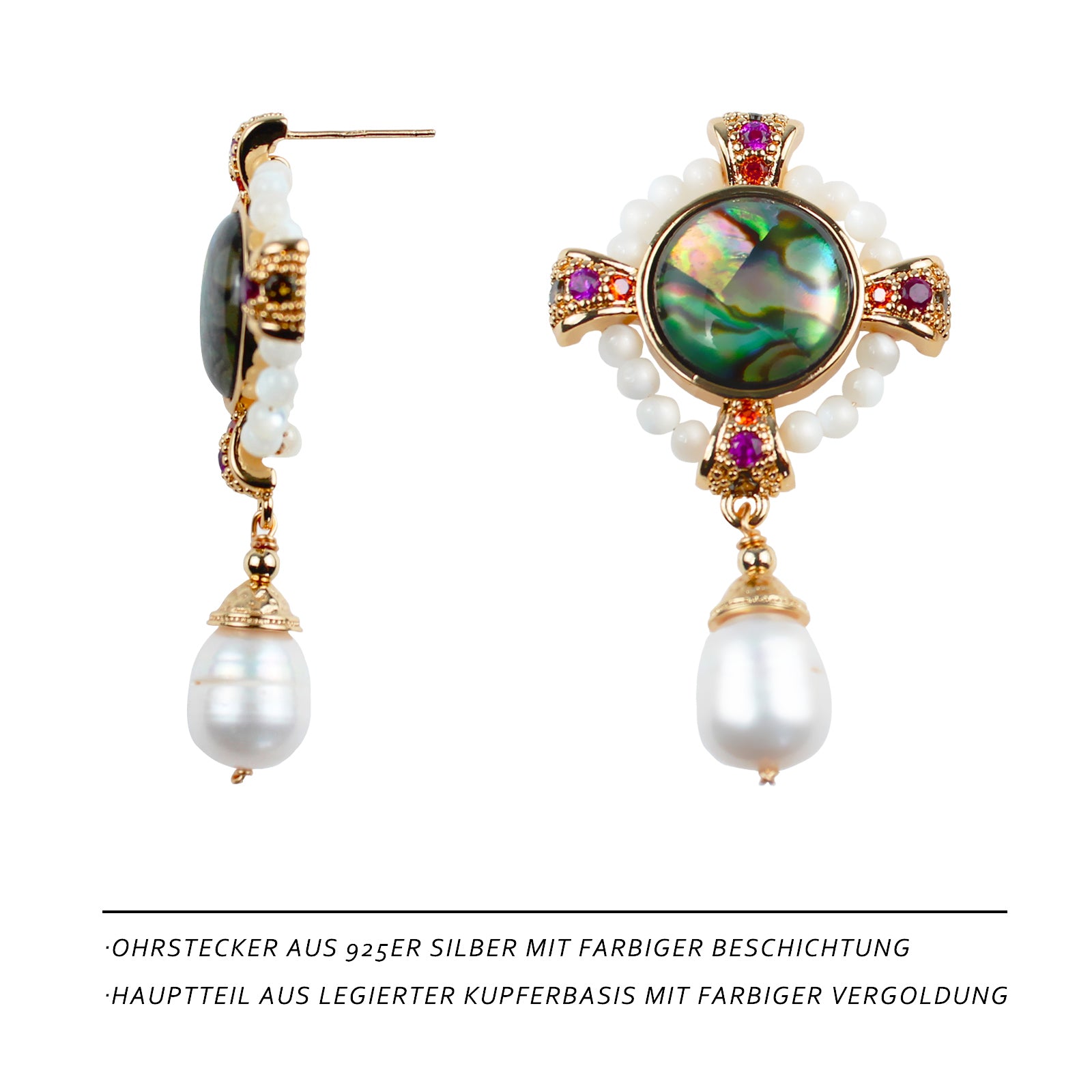 Vintage Abalone Perlenohrringe mit bunten Edelsteinen – 14K vergoldet, Extravagantes Design für Tanz & Feste
